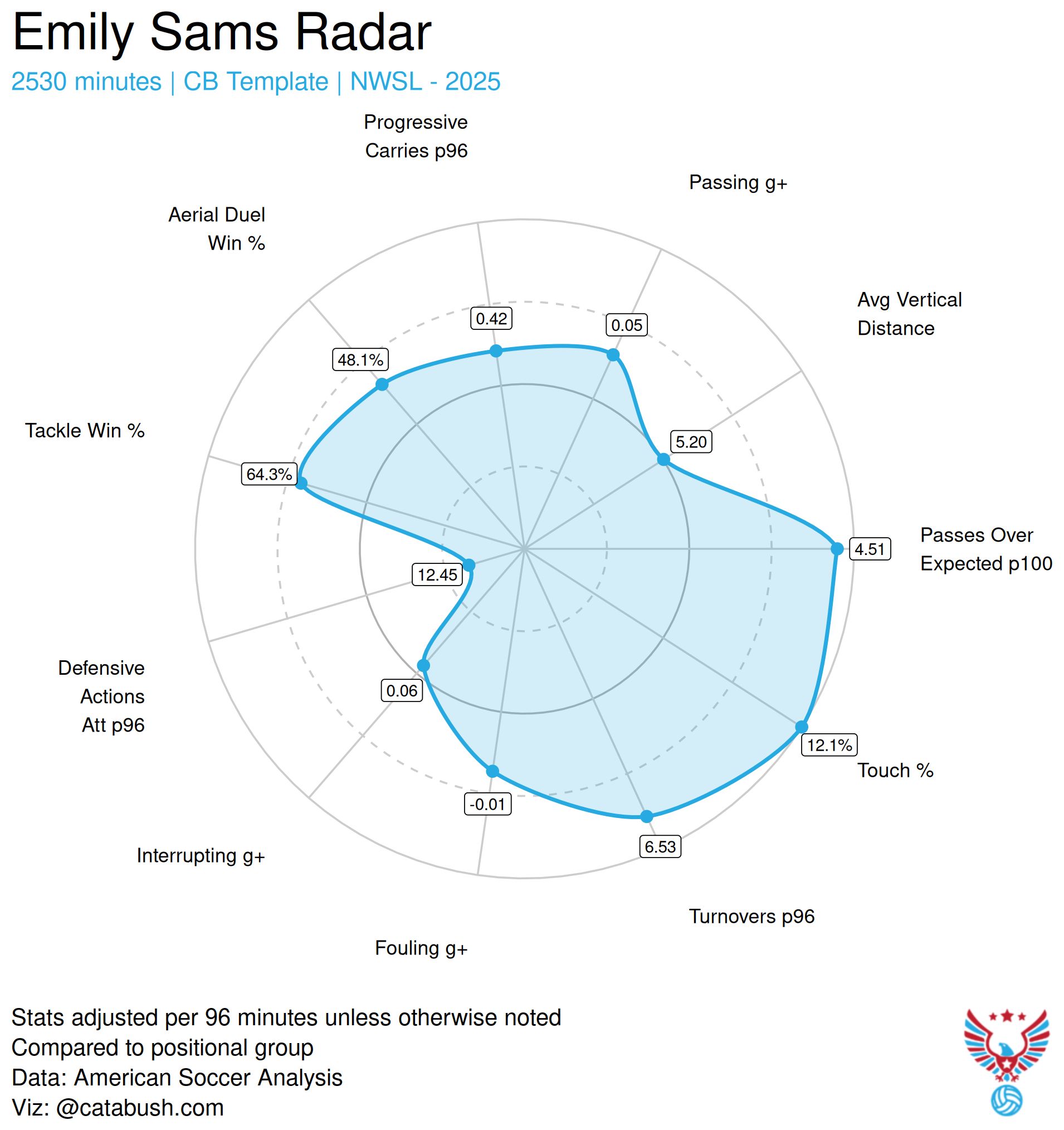 Sams is a good passer, and the best among these three. I will feel a lot more confident in her quarterbacking in a back three than Sara Doorsoun. Between her, King, and Gorden I think there will be a better balance of dynamism, progressive actions, and tidiness in the back. Overall, I think there will be less pressure on pacy wingers to dribble the ball entirely into the attacking third and there will be a bit more diversity in how Angel City progresses the ball.