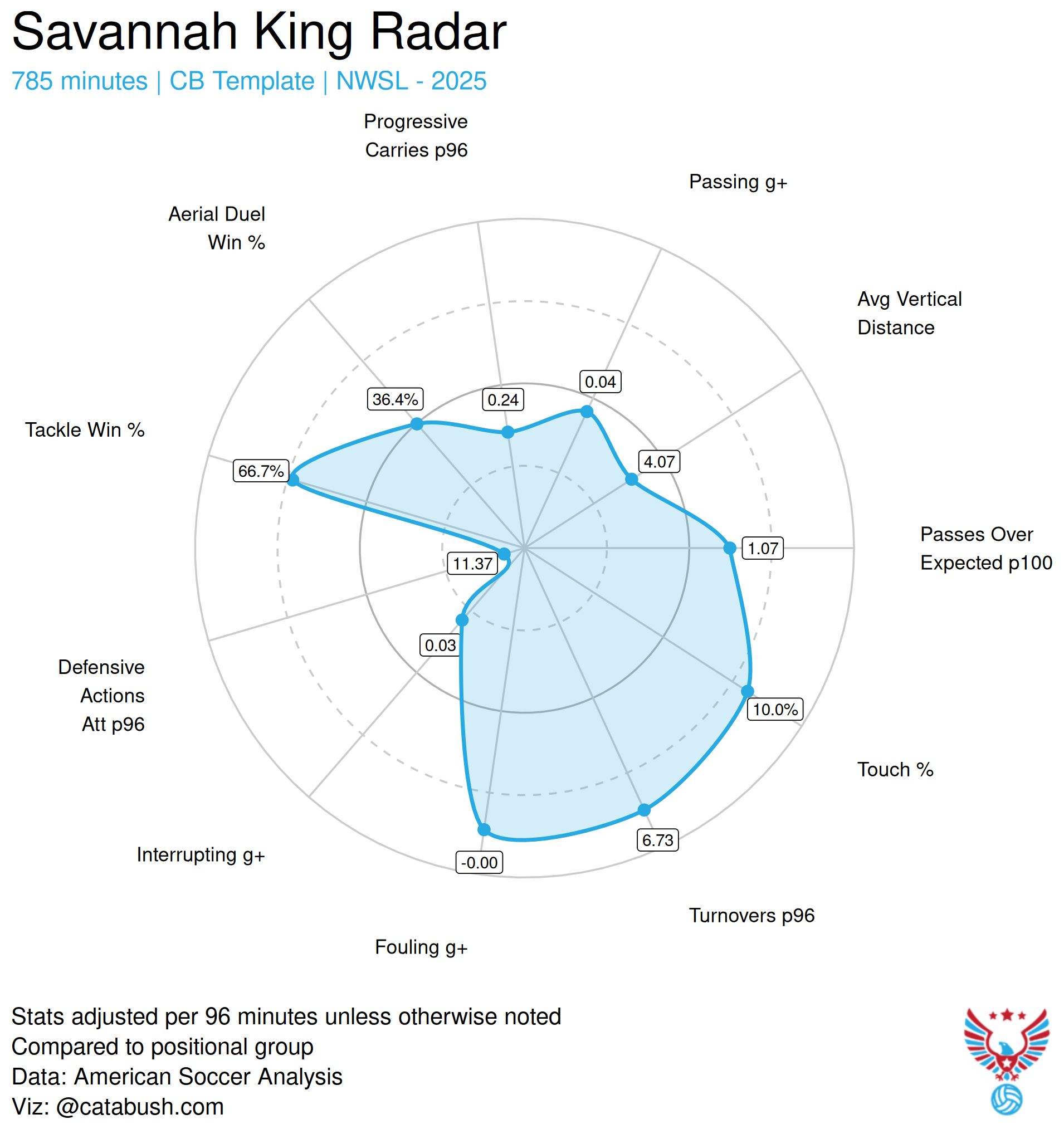 Above is a visualization ranking Angel City’s outfield college recruits by various metrics, by role, and overall. I don’t watch NCAA ball but all three field players seem to be solid pick ups with potential. It should be noted that Taylor Suarez out of FSU left college early to go professional, while Carina Lageyre and Karsyn Cherry were seniors, which may contribute to Suarez’s comparatively lower rankings. However, she rated highly in chance creation and finishing, which with some further development, will hopefully bolster the attack. At the Coachella Valley Invitational, it seemed like she was playing some right winger, so perhaps she shall be the heir apparent to Claire Emslie.
