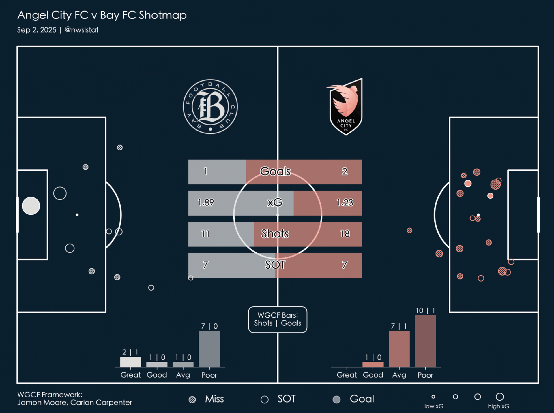 It wasn’t perfect, but over two performances, two victories in a row, Angel City has shown tangible growth. Since the break, they have conceded fewer goals and gotten points on the board. Angel City still needs to work on their quality chance creation. They have been taking a lot of shots, but not too many of above average quality (0.15 or higher). Per FBREF, Angel City lost the xG battle 1.2 to 1.5. However, it is of note that while Hill’s first shot was a big chance at 0.46, her actual goal was an even bigger one at 0.92, which heavily skewed their numbers. Without the goal converted off a close-range rebound, their xG is closer to 0.55. Either way, I think I’d like to see a lot more big circles on the Angel City shot map cropping up over time. They don’t seem to be there quite yet.