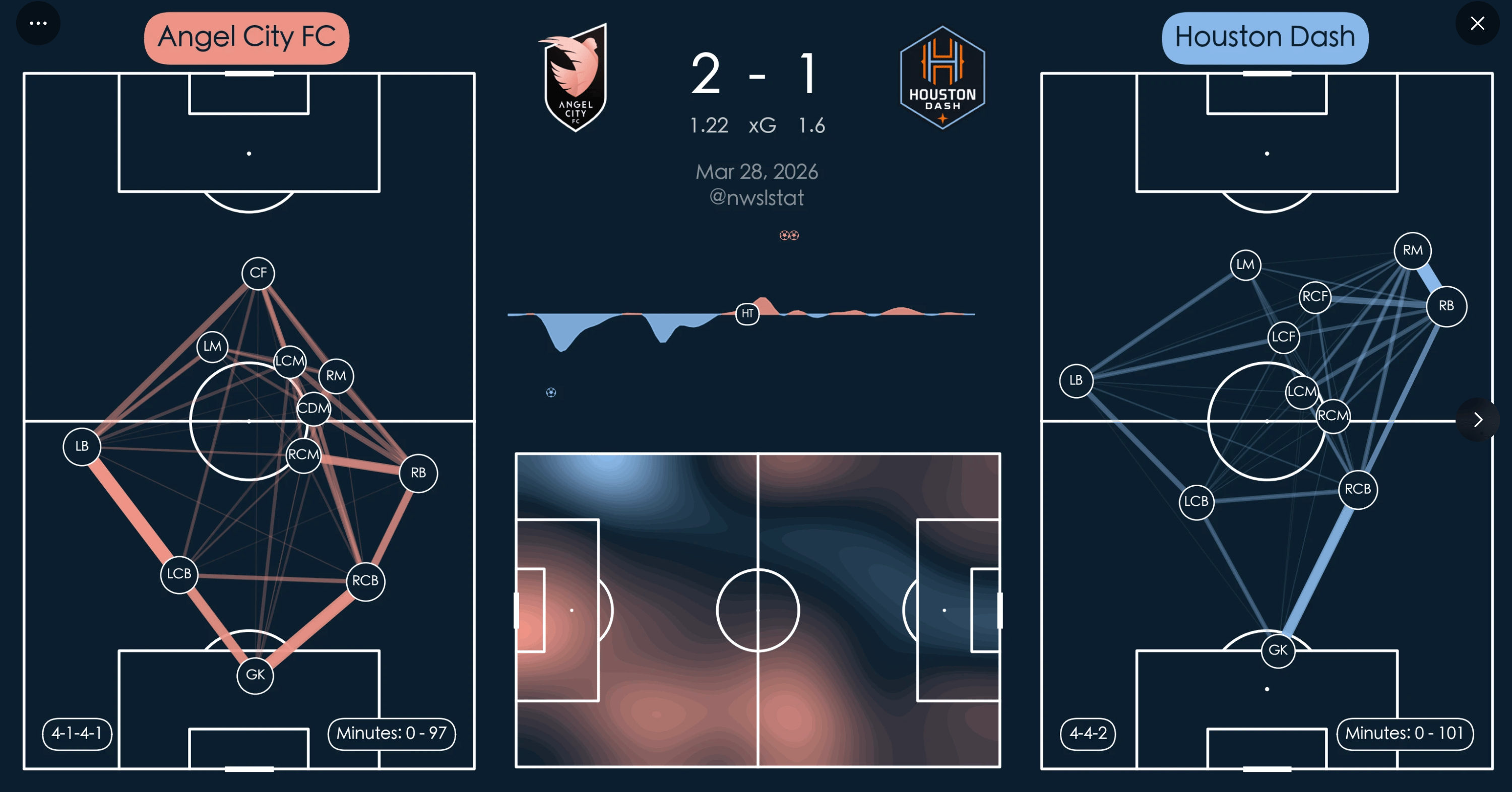 This was a challenging match, but ultimately gave way to a gratifying win. As can be seen above, Houston had all of the momentum in the first half. They laid the pressure on thick and did a good job of limiting Angel City’s opportunities. Honestly, Angel City couldn’t even string more than a couple of passes together. The build out was often too slow. That combined with the opposition’s pressure, Angel City was particularly vulnerable to counterattacks. Outside back Avery Patterson had a field day down Angel City’s left flank putting multiple defenders on skates to allow for her teammates to cut inside and get shots off. Luckily, only Maggie Graham’s went in and things could have been a lot worse walking into half time.