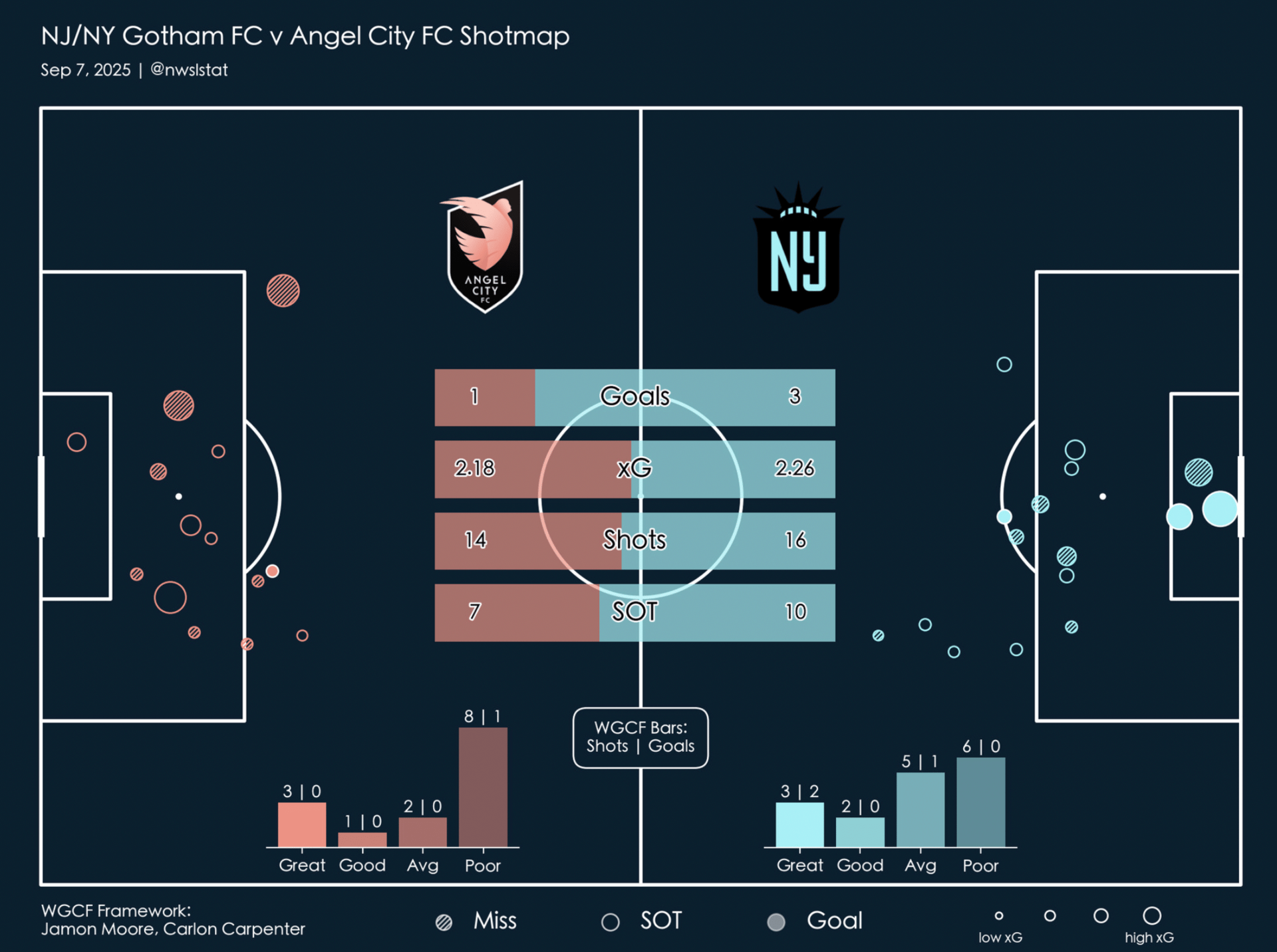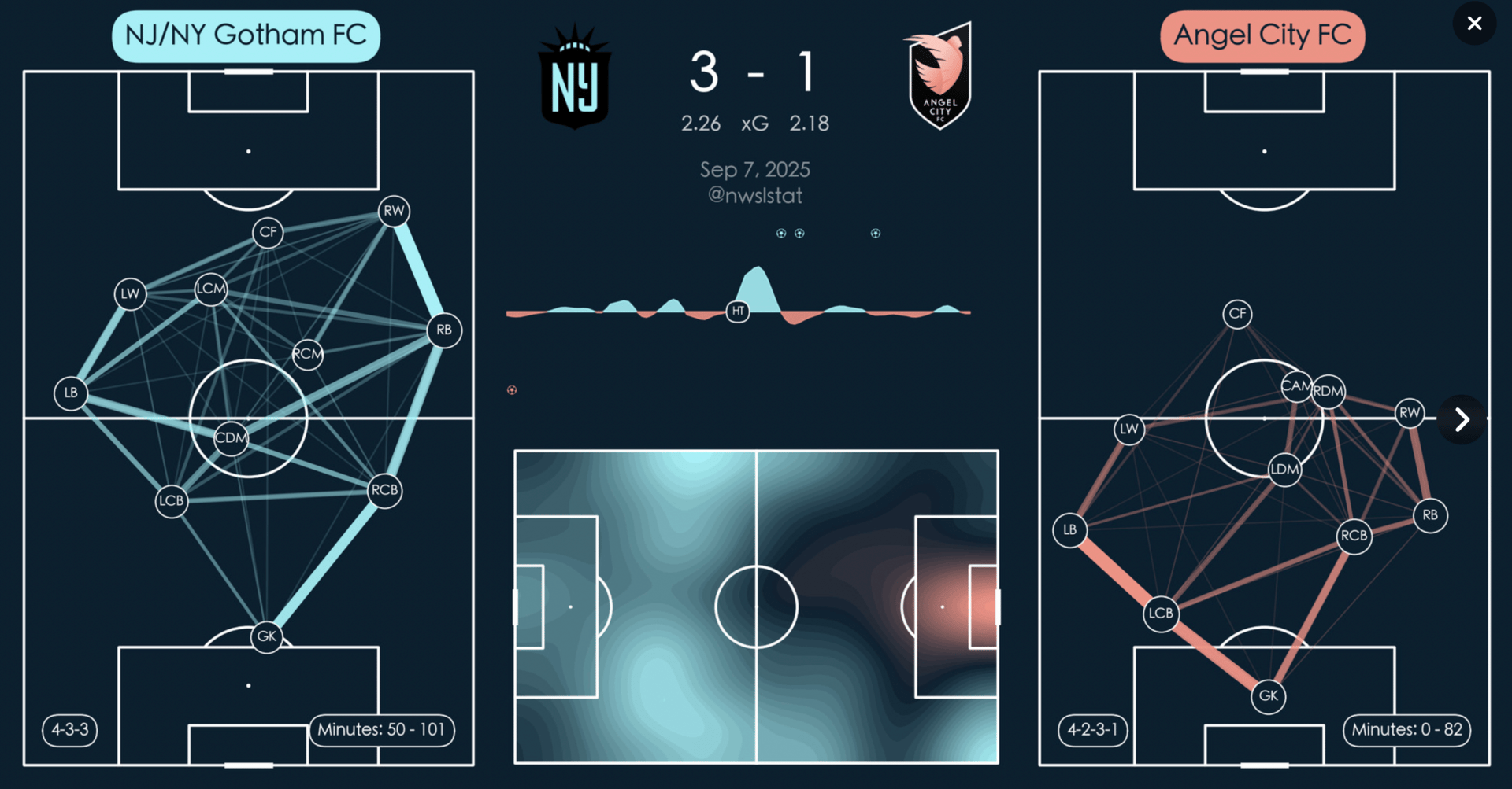 Angel City opened the scoring in the second minute with a pretty strike from Fuller. They continued to get opportunities going forward off of success in their press, and showed off some nice passing sequences in transition. Unfortunately, they weren’t able to close out a couple more big chances in the first half. Going into half time, things were feeling okay. Angel City looked composed and were getting into decent areas. At that time, they were winning the xG battle 1.18 to 0.78 with shots and shots on target looking fairly even.